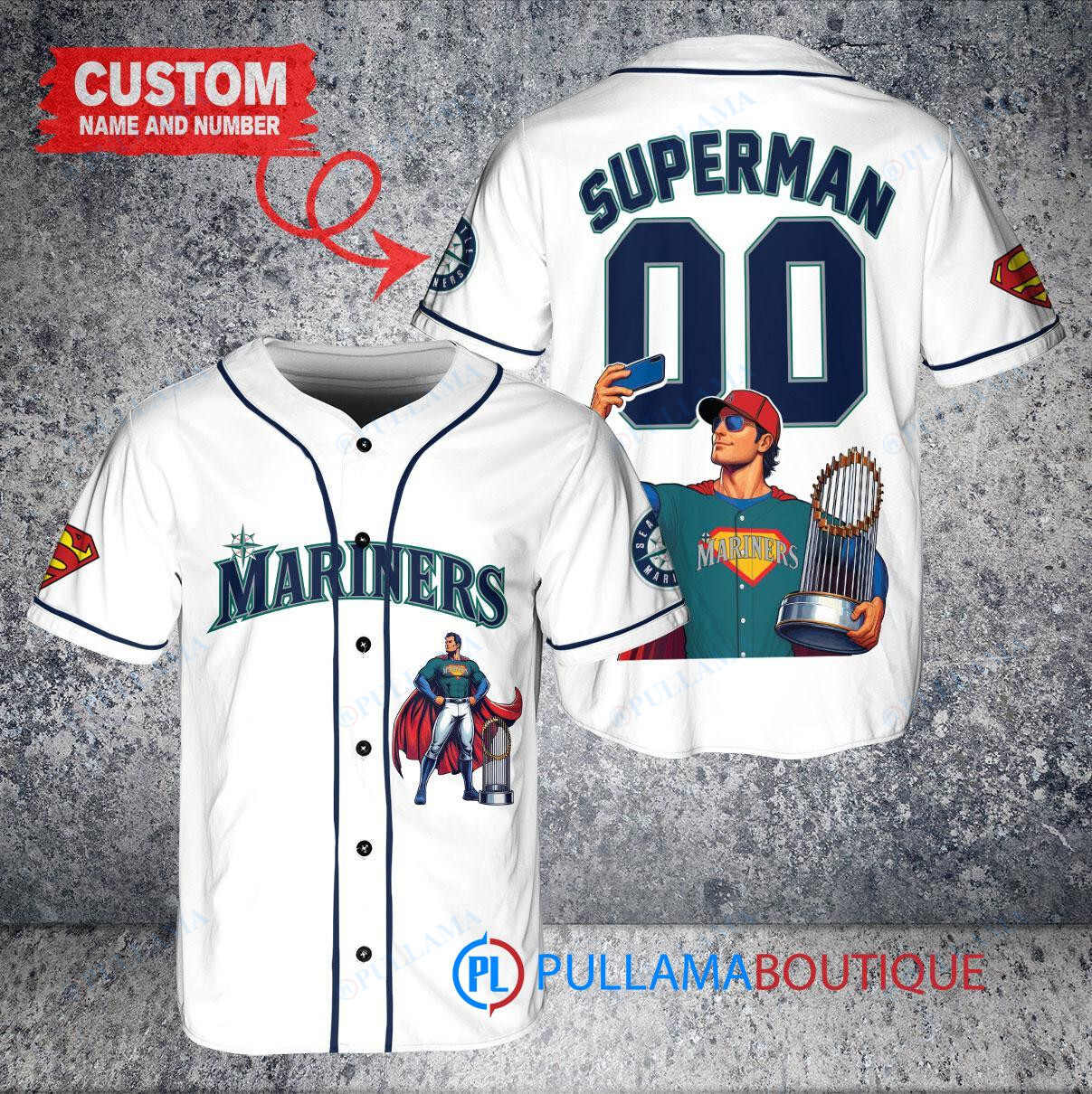 Show off your love for the Seattle Mariners and Superman with this custom baseball jersey featuring a unique DC Comics design. The white jersey is adorned with a trophy graphic, adding a fun and stylish touch to your game day outfit. Made with high-quality materials, this jersey is perfect for any baseball fan looking to stand out from the crowd. Get ready to cheer on your favorite team in superhero style!