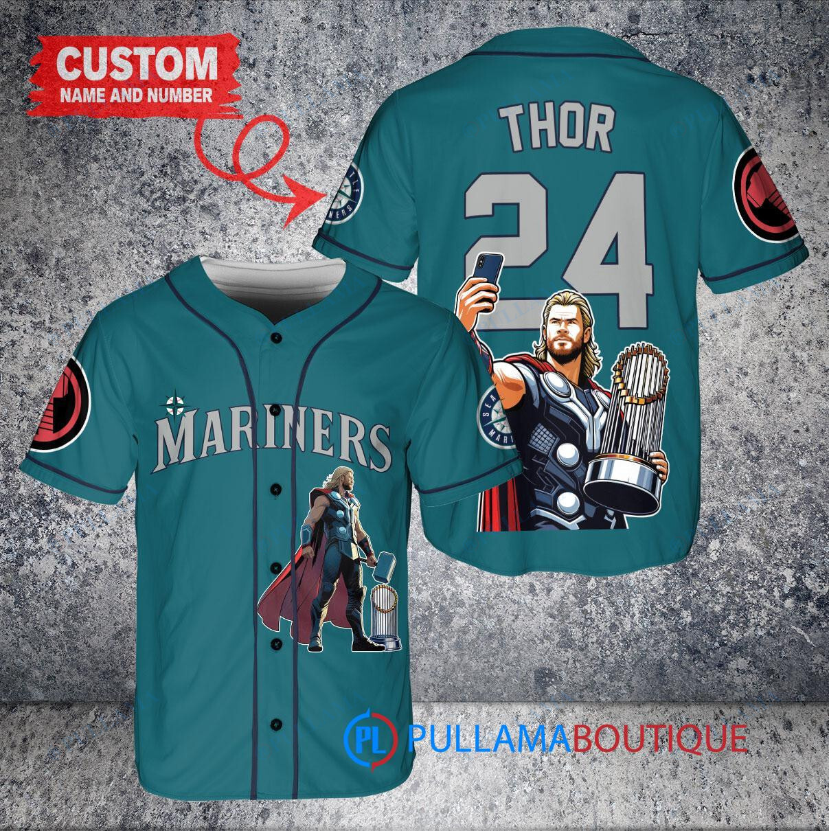 Seattle Mariners x Thor Marvel with Trophy Custom Baseball Jersey Aqua