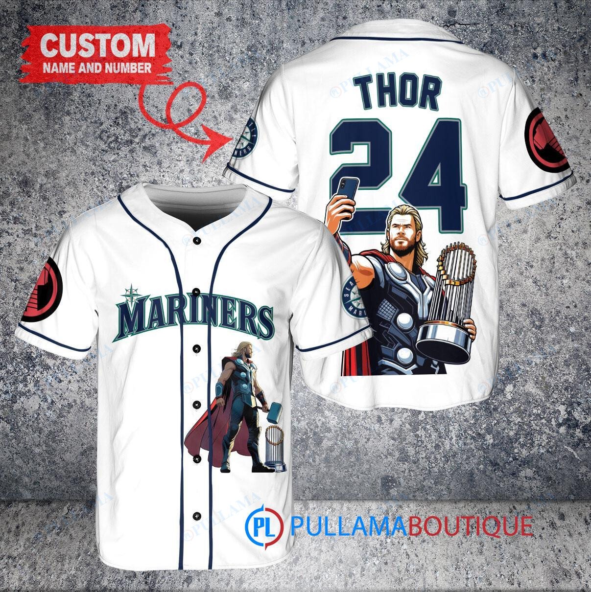 Show off your love for the Seattle Mariners and Thor with this custom baseball jersey. The white jersey features a unique design combining the Seattle Mariners logo with a Thor Marvel theme, complete with a trophy graphic. Perfect for any baseball fan looking to stand out in the crowd.