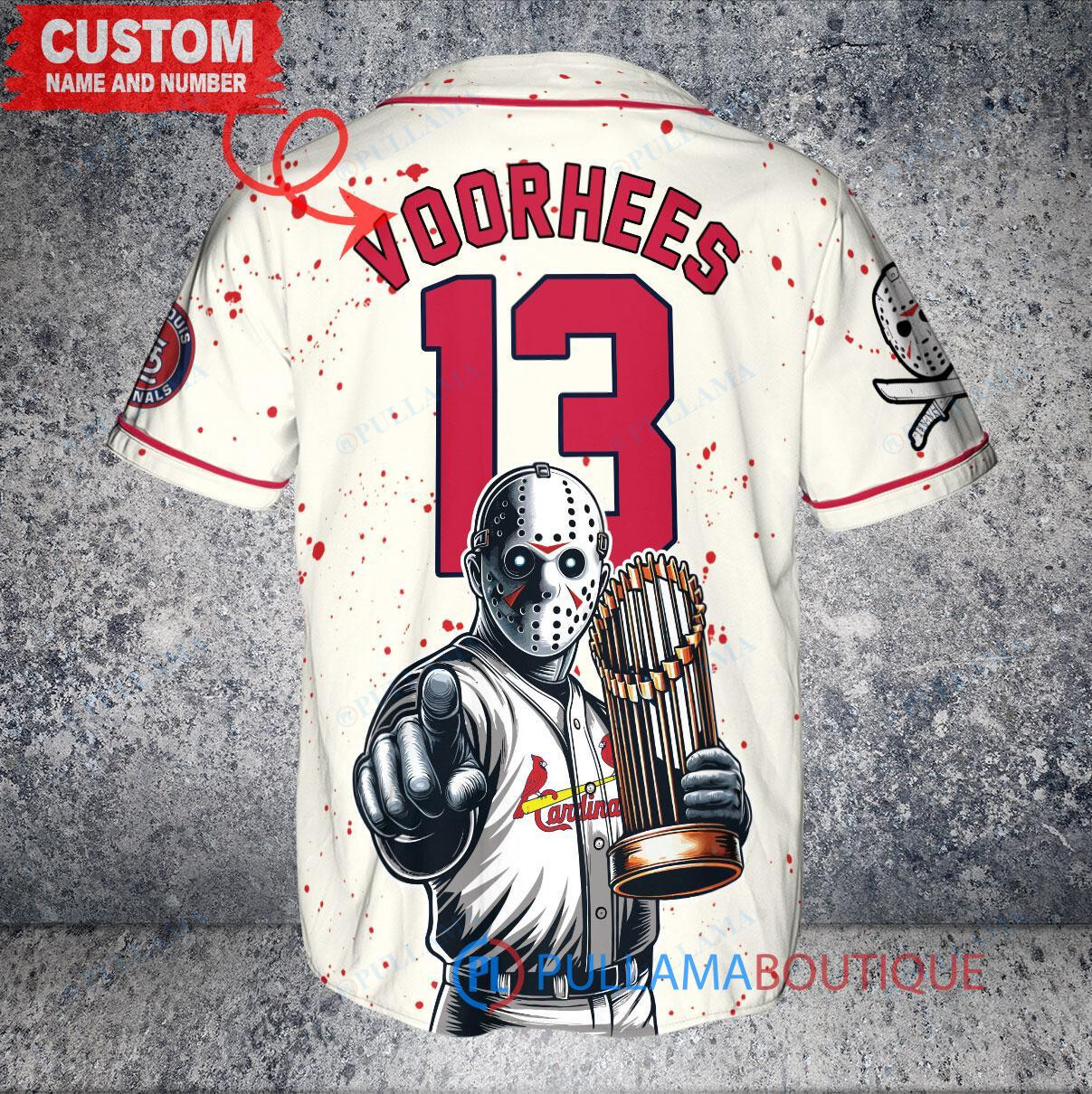 St. Louis Cardinals x Friday the 13th Jason Voorhees Halloween with World Series Trophy Custom Baseball Jersey Cream