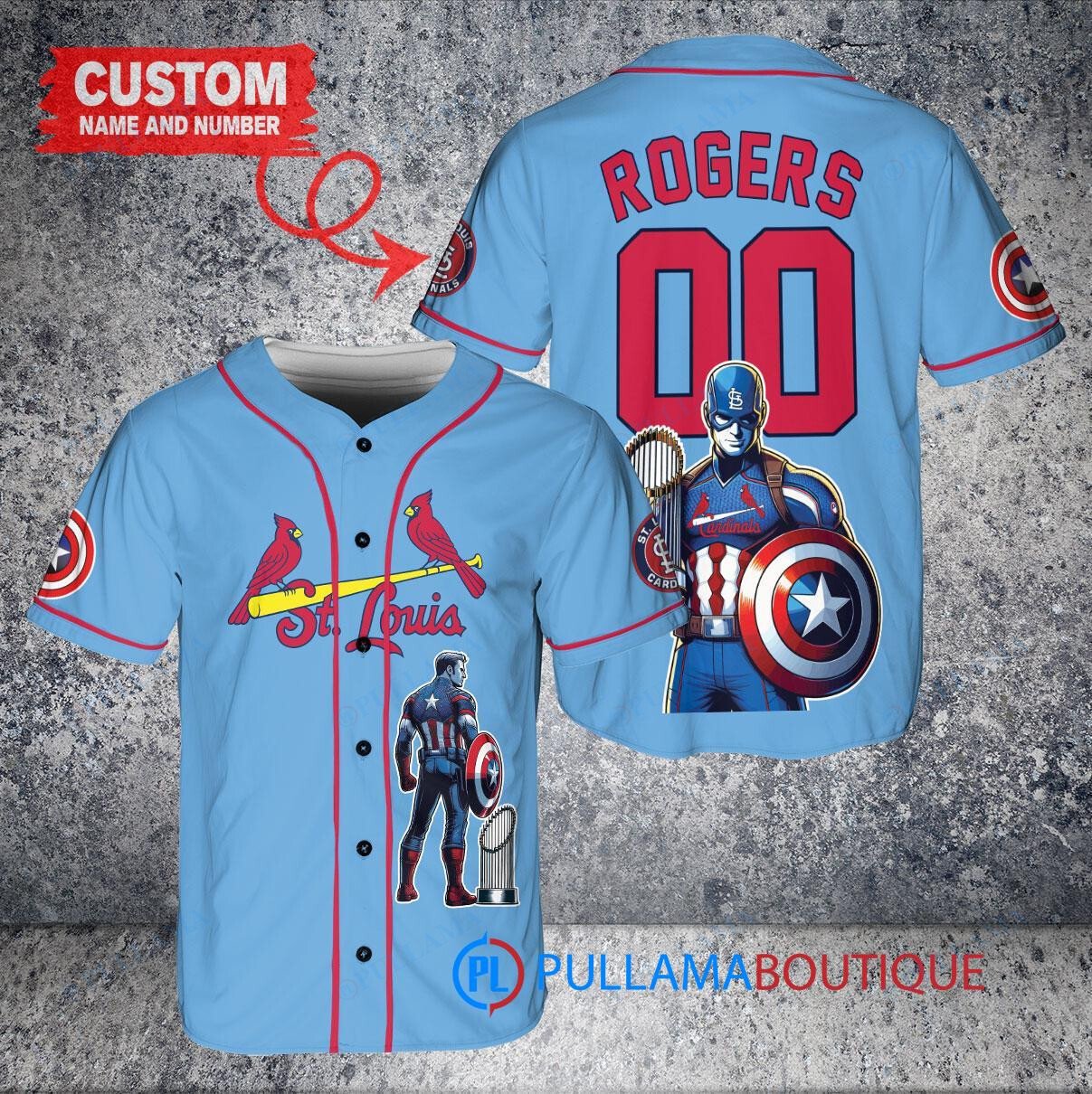 Show off your love for the St. Louis Cardinals and Marvel with this custom baseball jersey featuring Captain America Steve Rogers. The light blue jersey is designed with the team’s logo and colors, along with a trophy graphic to celebrate their victories. Perfect for any fan looking to stand out at the game or just show off their unique style.