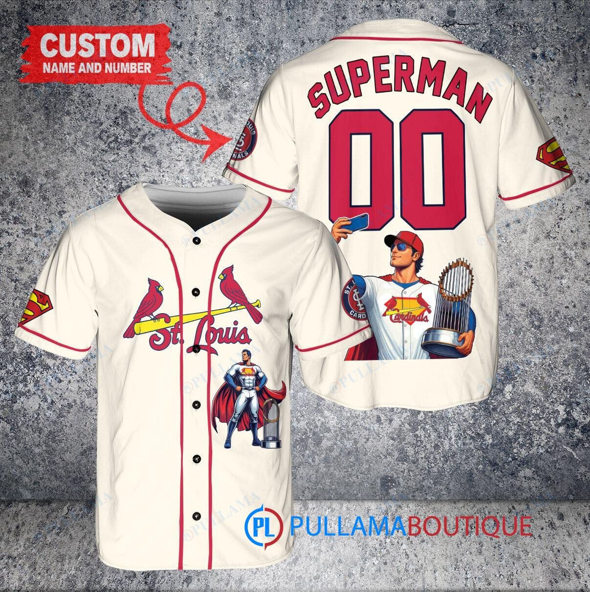 Show off your love for the St. Louis Cardinals and Superman with this custom baseball jersey. Featuring a unique design combining the iconic Cardinals logo with Superman’s emblem, this cream-colored jersey is sure to turn heads. Made with high-quality materials, this jersey is perfect for any baseball fan looking to stand out from the crowd. Get yours today and feel like a superhero on and off the field!