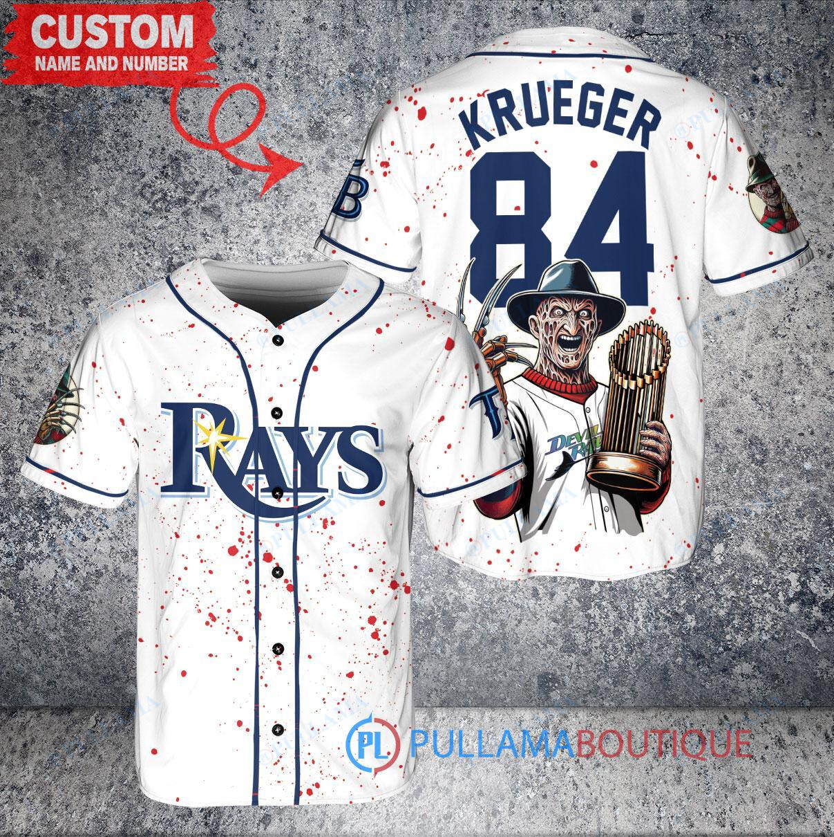 Get ready for Halloween with this Tampa Bay Rays Freddy Krueger World Series Trophy Jersey! This white replica jersey features a spooky design inspired by the iconic horror character Freddy Krueger. Perfect for any Rays fan looking to show off their team spirit in a unique and festive way. Add this jersey to your collection and stand out from the crowd this Halloween season!