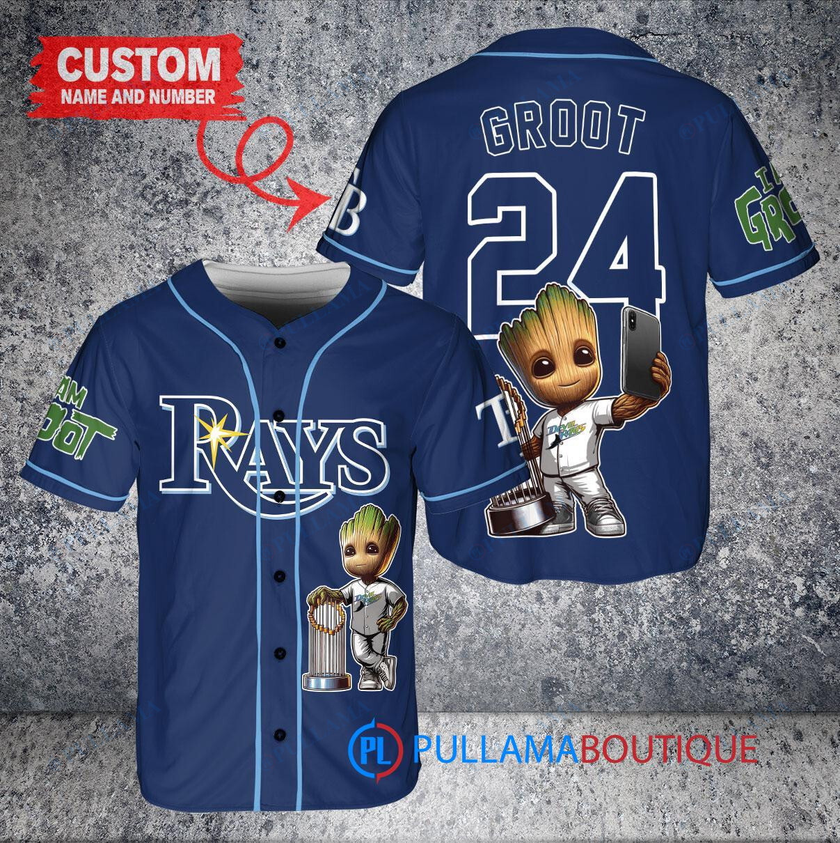 Show off your love for the Tampa Bay Rays and Marvel’s Guardians of the Galaxy with this custom baseball jersey featuring Baby Groot holding a trophy. This navy jersey is perfect for any fan looking to stand out in the crowd. Made with high-quality materials, this jersey is both stylish and comfortable, making it a great addition to any fan’s collection. Get yours today and show your support for your favorite team and superhero!
