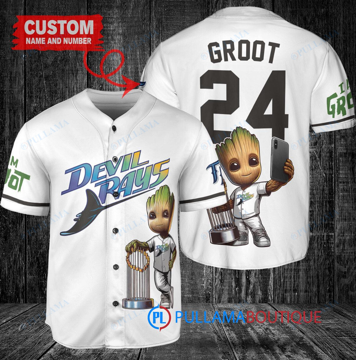Show off your love for the Tampa Bay Rays and Marvel’s Guardians of the Galaxy with this custom baseball jersey featuring Baby Groot. This white home replica jersey is perfect for any fan looking to stand out in the crowd. The jersey also comes with a trophy design, adding a unique touch to your game day outfit. Get ready to root for your favorite team in style with this one-of-a-kind jersey!