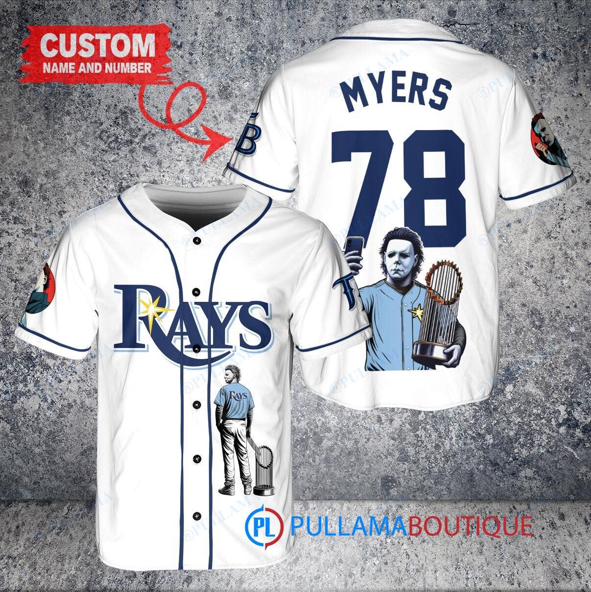 Tampa Bay Rays x Halloween Michael Myers with Trophy Custom Baseball Jersey White Alternate Replica