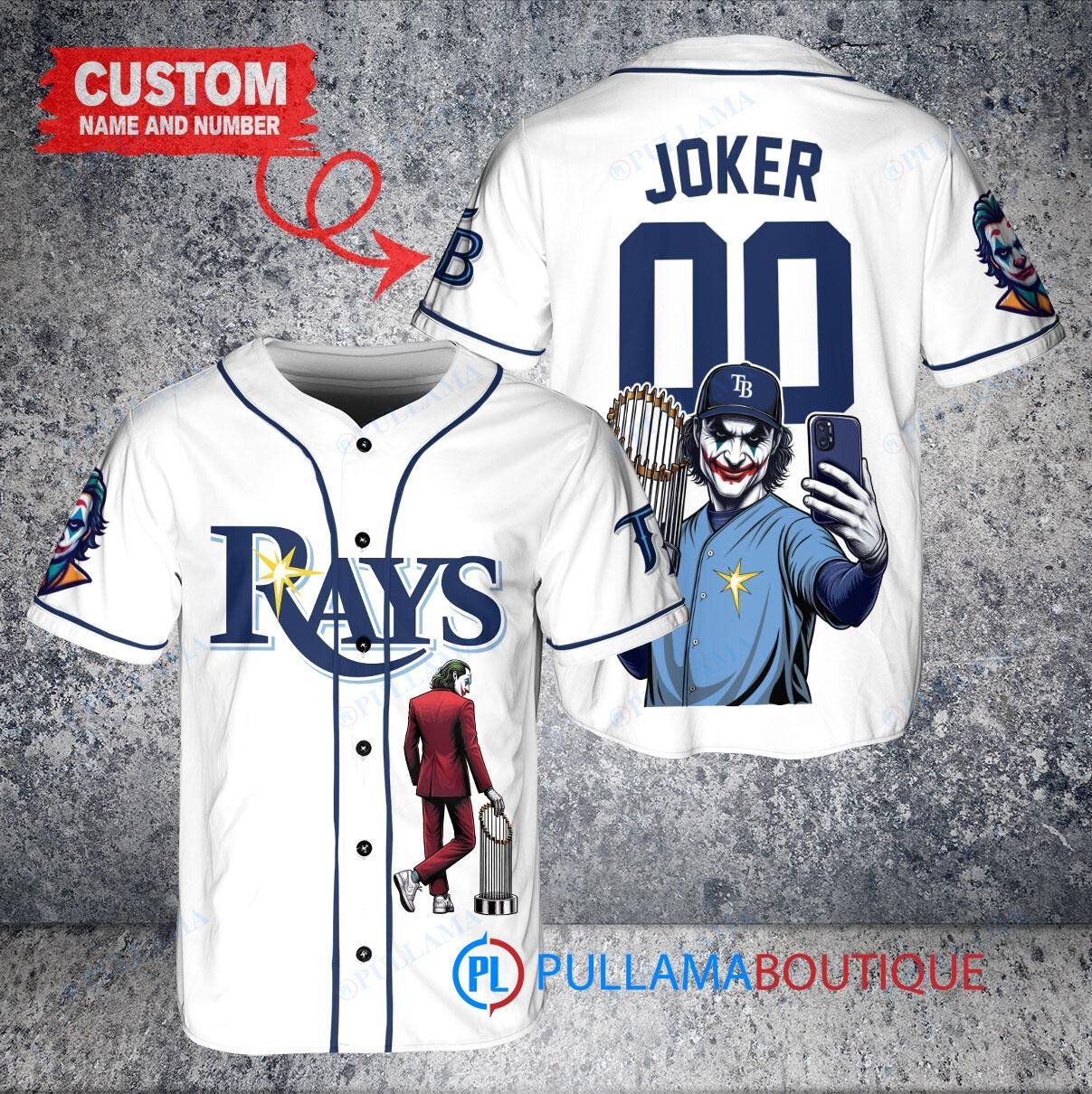 Show off your love for the Tampa Bay Rays and the Joker from DC Comics with this custom baseball jersey. The white alternate replica jersey features a unique design with the Joker holding a trophy, adding a fun and playful twist to your game day outfit. Made with high-quality materials, this jersey is perfect for any baseball fan looking to stand out from the crowd. Get yours today and hit a home run with your style!