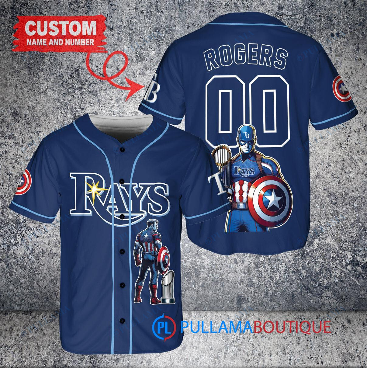 Show your support for the Tampa Bay Rays with this custom baseball jersey featuring Marvel’s Captain America Steve Rogers. The navy jersey is designed with the team’s logo and colors, along with a trophy emblem to celebrate their victories. Perfect for any fan looking to represent their favorite team and superhero on game day.