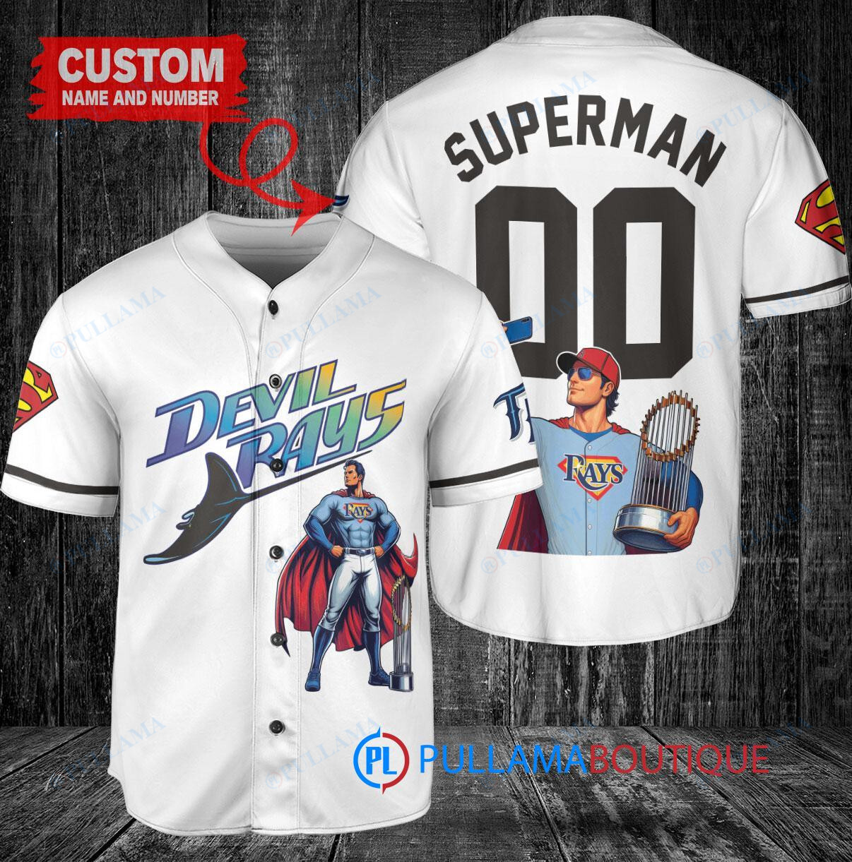 Tampa Bay Rays x Superman DC Comics with Trophy Custom Baseball Jersey White Home Replica