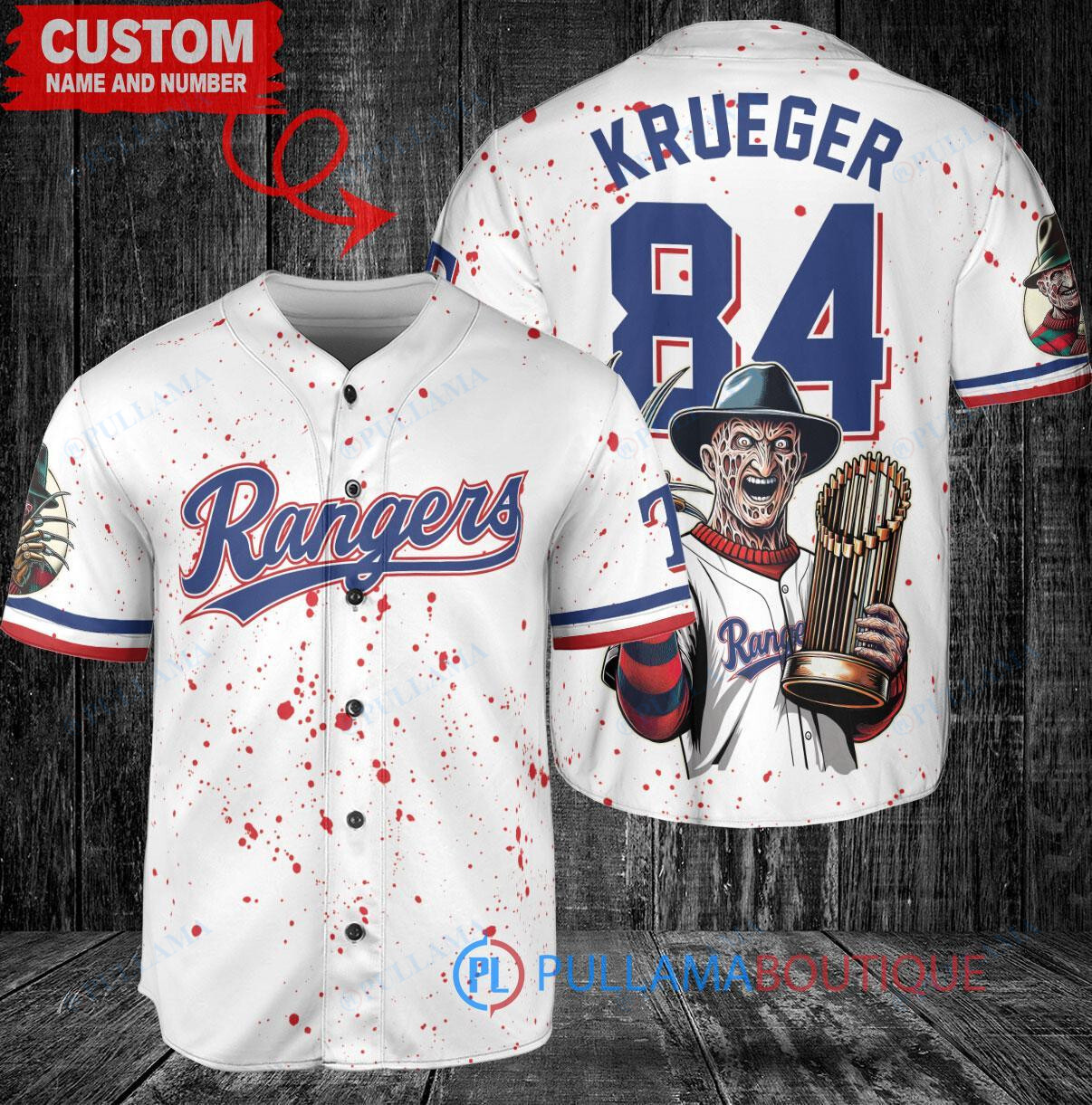 Get ready for Halloween with this Texas Rangers x Freddy Krueger World Series Trophy Baseball Jersey in white. This unique jersey features a spooky twist with Freddy Krueger’s iconic glove and stripes, perfect for any baseball fan looking to add a touch of horror to their wardrobe. Made with high-quality materials, this jersey is sure to stand out at any Halloween party or baseball game. Add a creepy touch to your collection with this one-of-a-kind jersey.