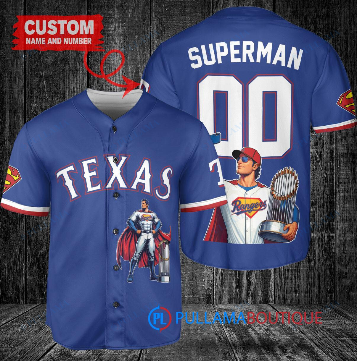Show off your love for the Texas Rangers and Superman with this custom baseball jersey featuring a unique DC Comics design. The royal blue jersey is accented with the iconic Superman logo and comes with a trophy emblem, perfect for any fan looking to stand out at the game. Made with high-quality materials, this jersey is both stylish and comfortable, making it a must-have for any baseball enthusiast.